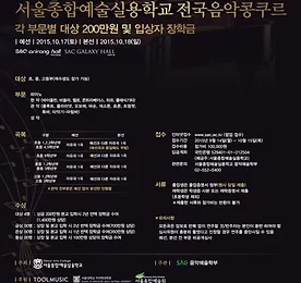 2015 제7회 서예종 전국음악콩쿠르 개최 각 부문별 대상 200만원 등 총 800만원 수여 [시사타임즈 = 김혜경 기자] 서울종합예술실용학교(이사장 김민성, 이하 서예종)이 주최하는 제7회 서울종합예술실용학교 전국음악콩쿠르가 오는 10월17일, 18일 양일간 서종예 SAC아리랑홀과 SAC갤럭시홀에서 열린다. 초, 중, 고등학생을 대상으로 피아노, 현악(바이올린, 비올라, 첼로, 콘트라베이스, 하프, 클래식기타), 관악(플르트, 클라리넷, 오보에, 바순, 색소폰, 호른, 트럼펫, 튜바, 타악기-미림바), 성악 부문으로 나누어 진행된다. 서울대학교 치의학대학원, 툴뮤직엔터테인먼트 등이 후원하는 이번 행사의 각 부문 대상 수상자에게는 상금 200만원과 1,400만원 상당의 2년 전액 장학금이 수여된다. 금상..