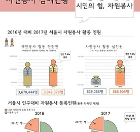 서울시, 인구 감소에도 자원봉사 늘어…작년 394만명 참여 [시사타임즈 = 박수연 기자] 서울시자원봉사센터는 2017년 한 해 394만 명 이상의 서울시민이 자원봉사 활동에 참여했다고 밝혔다. ▲사진제공=서울시. ⒞시사타임즈 2017년 자원봉사 활동에 참여한 총인원수(연인원)는 3,942,378명으로 2016년 3,670,444명에 비해 7.4% 증가했다. 또 자원봉사 활동에 참여한 총인원 중 1회 이상 활동한 자원봉사자 수(실인원)는 688,909명으로 16년 639,355명에 비해 7.8% 증가하는 것으로 나타났다. 2017년 자원봉사 활동 중 가장 많은 시민이 참여한 분야는 활동 보조, 아동지원, 급식 지원 등의 ‘생활편의’분야였으며 그다음으로 공연활동, 캠페인, 관광 안내 등의 ‘문화행사인구 감소..