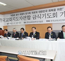 한국교계 지도자들 “세월호 참사에 책임 통감한다”한국교회지도자연합 금식기도회, 21일 한국교회100주년 기념관서 개최 [시사타임즈 = 탁경선 기자] 한국교계 지도자들이 한 자리에 모여 “세월호 참사에 책임통감을 느낀다”면서 “앞으로 개최할 한국교회지도자연합 금식기도회는 세월호 참사 희생자 유가족 위로 기도회로 열릴 예정이다”고 밝혔다. 이와 관련해 한국교회교단장협의회(교단협)는 5월12일 오전 10시 기감 전용재 감독회장, 기성 조일래 총회장, 기침 김대현 총회장, 기하성(여의도순복음) 최길학 부총회장, 예장백석 장종현 총회장, 예장통합 김동엽 총회장과 한국공공정책개발연구원 장헌일 원장이 참석한 가운데 기자회견을 열고 금식기도회 계획과 취지를 설명했다. 한국교회 감리교와 기성, 기하성, 기침, 고신, 대..